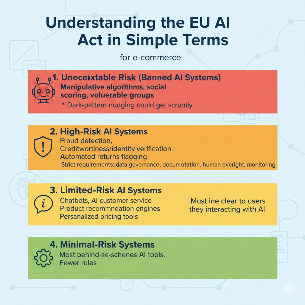 The Act classifies AI systems into four tiers of risk. Not every AI used in e-commerce falls into a high-risk category, but many do. Here’s the simplified breakdown: