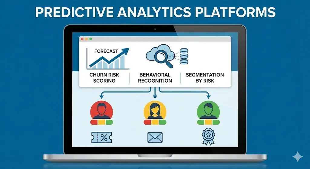Predictive analytics tools use machine learning models to assign each customer a churn probability score. These platforms process historical and real-time data such as purchases, browsing activity, and engagement metrics.